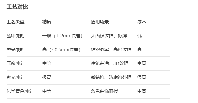 工藝過程:通過絲網印刷將耐酸油墨印在不銹鋼表面,形成保護層,然后用化學蝕刻液(如氯化亞鐵)腐蝕未保護區域,形成圖案。