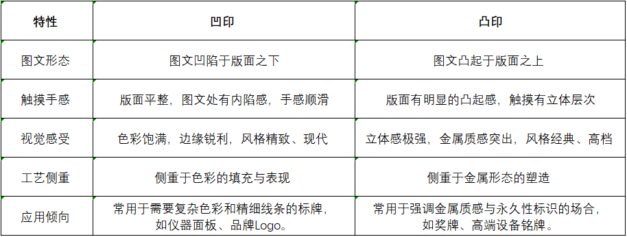 凸印(陽印):指圖文部分高于版面。通過腐蝕或沖壓使空白部分凹陷,保留圖文部分凸起。上色時,可以對凸起部分進行噴漆、電鍍等處理,或者保留鋁材本色,形成強烈的金屬質(zhì)感與觸摸感。